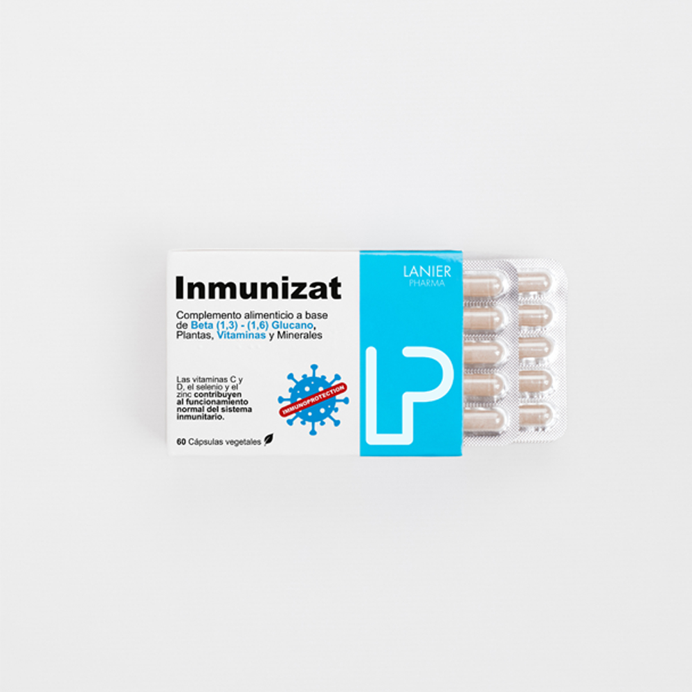 INMUNIZAT es un complemento alimenticio con Betaglucano (1,3)-(1,6), Vitamina C, Vitamina D, Zinc, Selenio y Ácido Tánico, que por su acción inmunomoduladora está especialmente indicado en la prevención y tratamiento de infecciones por virus y bacterias.
